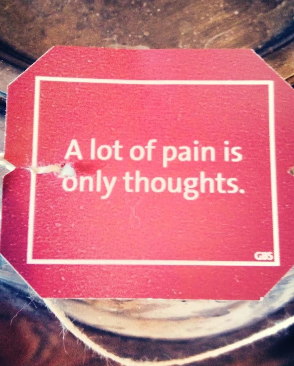 Ik ben gek op spreuken, die wijsheden in één zin. Tegeltjeswijsheid, zoals Oost West, Thuis Best zijn best geinig maar dat is niet echt wat ik bedoel. Uitspraken, verhaspelingen, gezegden, of grappige uitlatingen van Loesje zoals: ‘Ik bepaal zelf wel hoe eigenwijs ik ben’ zorgen ervoor dat ik glimlach in mezelf. Maar ik ga ook erg aan op spreuken zoals deze: ‘A lot of pain is only thoughts’. Een spreuk waar je even over moet nadenken. Van die meditatieve input over de diepere lagen van het leven. Zo’n lekker krachtige, tekstuele snack, waar je even je gedachten over kunt laten gaan.
